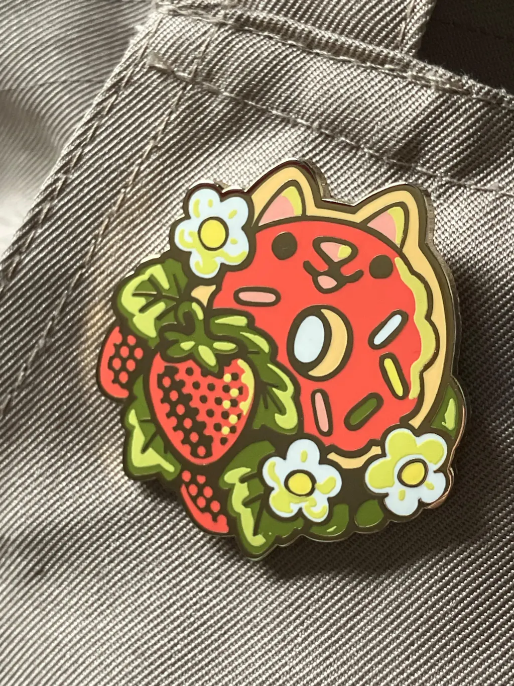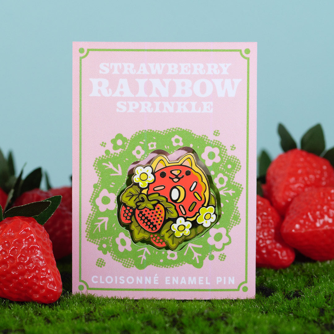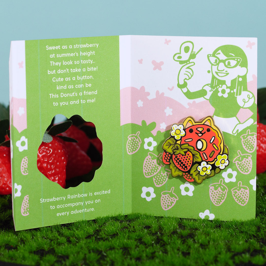 Take a little bit of sweetness with you on any adventure with the help of our Strawberry Rainbow Donut Cat enamel pin. Each travel-sized friend is ~1.5” across, and has two back posts with rubber backers.